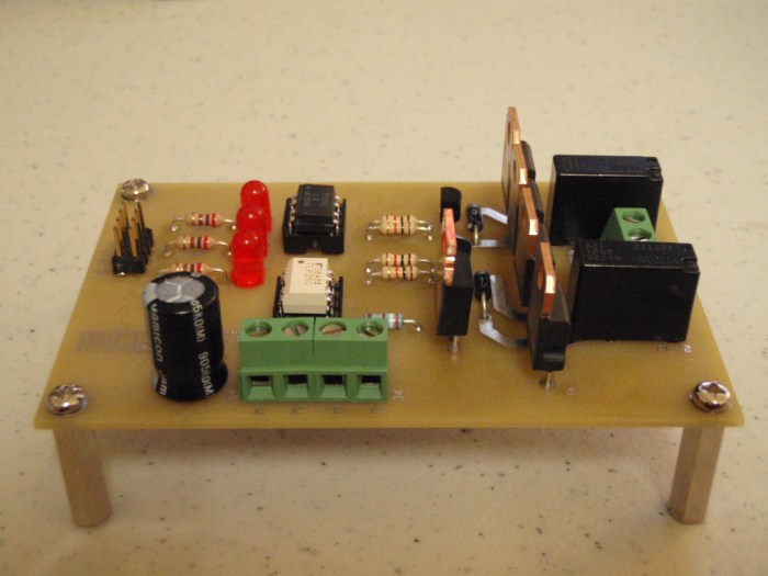 All of the components are through-hole and easy to solder. You may need to add a heatsink to the MOSFET and Schottky Diodes.