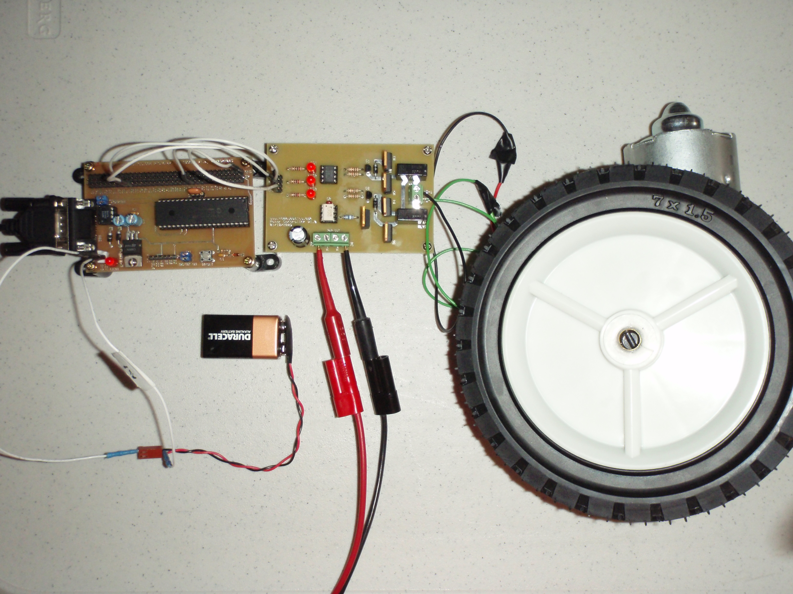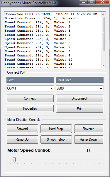 Below is a screenshot of the test application used to vary the speed and direction of the attached motor. Commands are sent to a PIC16F877A test board I developed through the serial port. These commands are translated into speed and direction.