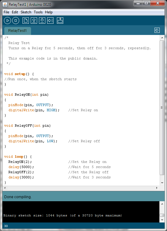 /* Relay Test Turns on a Relay for 5 seconds, then off for 3 seconds, repeatedly. This example code is in the public domain. */ void setup() { //Run once, when the sketch starts } void RelayON(int pin) { pinMode(pin, OUTPUT); digitalWrite(pin, HIGH); //Set Relay on } void RelayOFF(int pin) { pinMode(pin, OUTPUT); digitalWrite(pin, LOW); //Set Relay off } void loop() { RelayON(2); //Set the Relay on delay(5000); //Wait for 5 seconds RelayOFF(2); //Set the Relay off delay(3000); //Wait for 3 seconds }