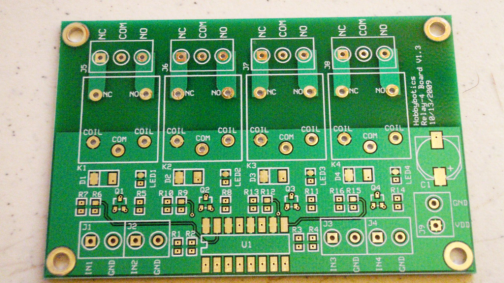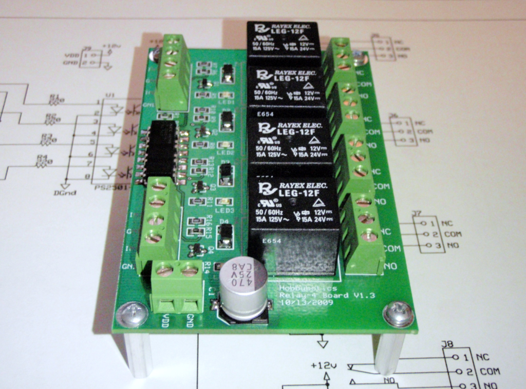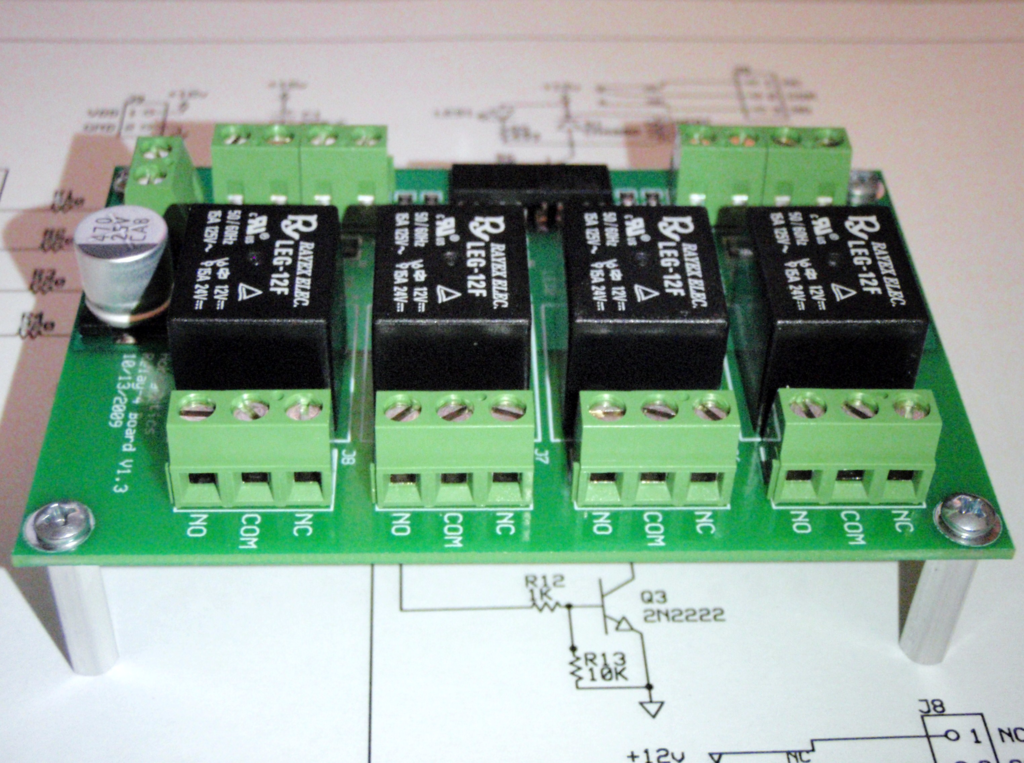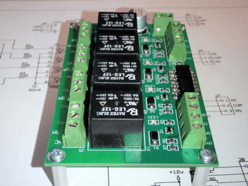 This project details an optoisolated relay board designed to switch on/off AC or DC devices. There are 4 relays per board and each can switch 125VAC @ 15A or 12-24VDC @ 15A. Each relay is isolated from the associated digital logic input pin. Control can be accomplished by applying a high or low signal from a micro-controller output pin or, simply by applying a switchable 5V signal.