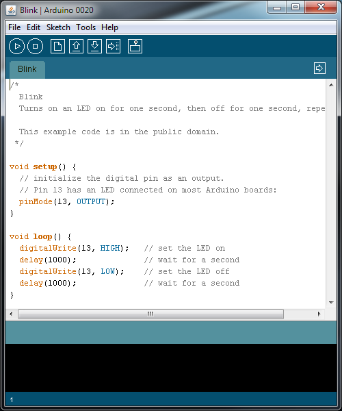 /* Blink Turns on an LED on for one second, then off for one second, repeatedly. This example code is in the public domain. */ void setup() { // initialize the digital pin as an output. // Pin 13 has an LED connected on most Arduino boards: pinMode(13, OUTPUT); } void loop() { digitalWrite(13, HIGH); // set the LED on delay(1000); // wait for a second digitalWrite(13, LOW); // set the LED off delay(1000); // wait for a second }