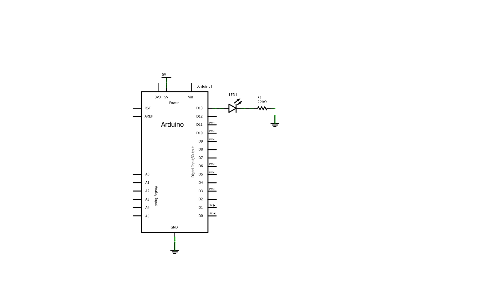2. Connect a LED and resistor to digital pin 13 like below.