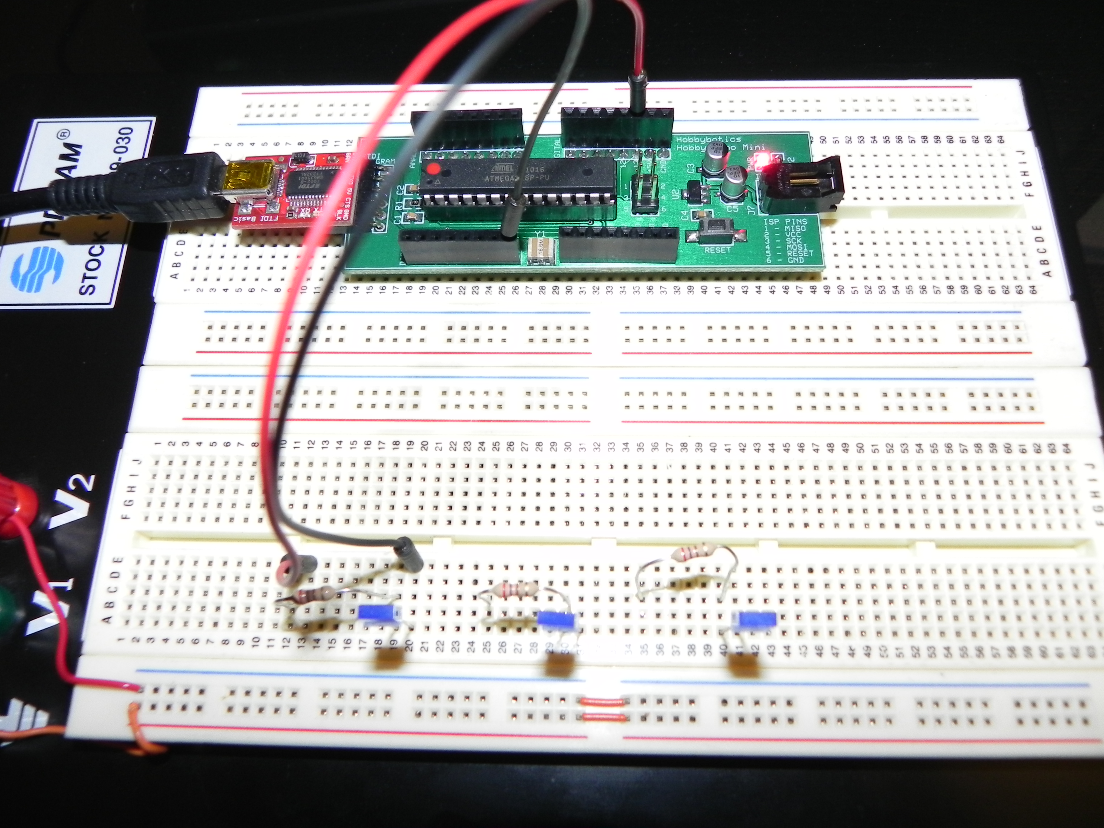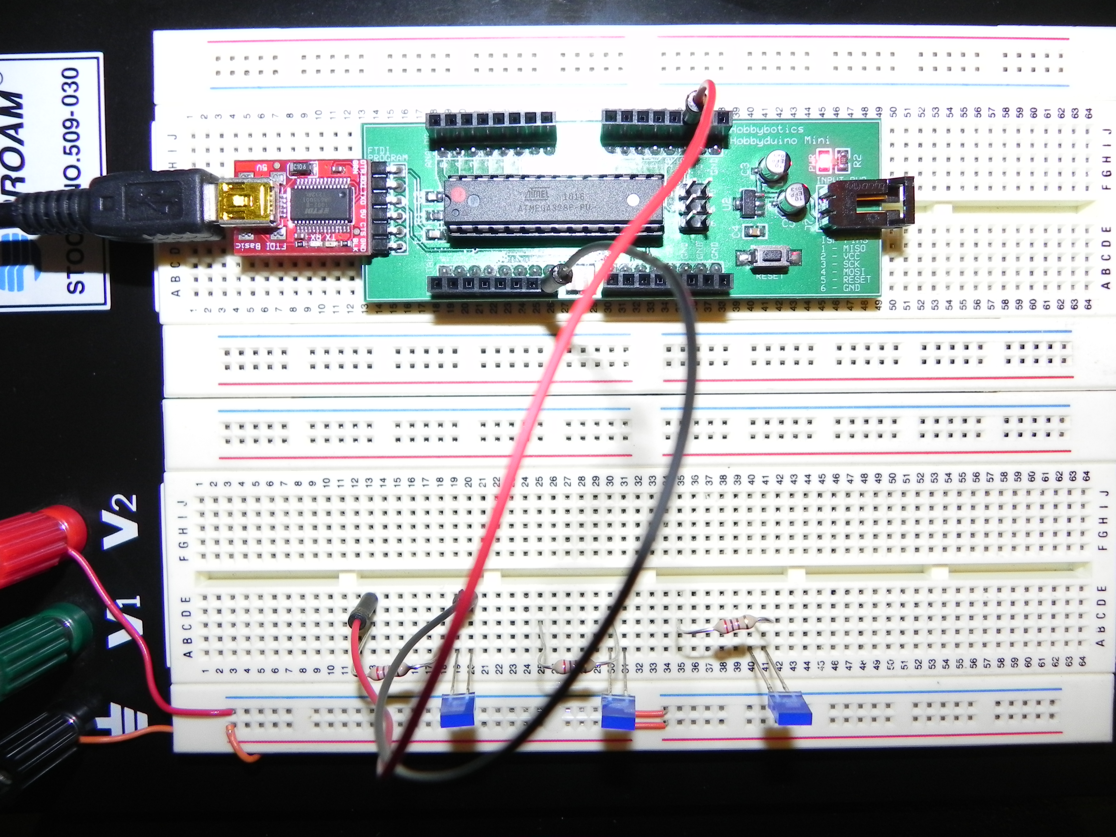The Hobbyduino does not contain the circuitry for USB communication. I opted to rely on the FTDI232R serial boards to handle the USB-to-Serial protocol. Here is the one I use but, others are available.