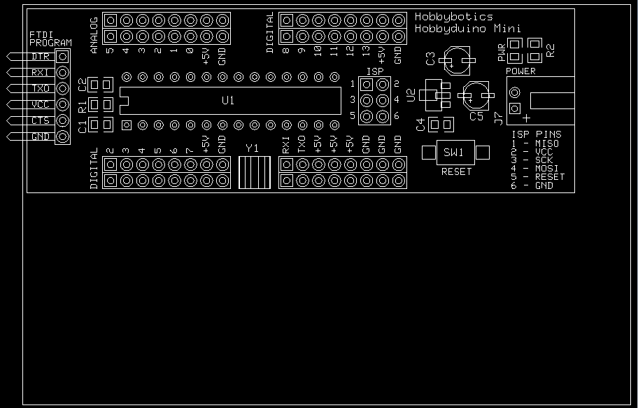 The Hobbyduino Mini is a clone of the Arduino main-board. It contains a ATMega328 processor programmed with the Arduino bootloader.
