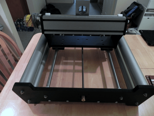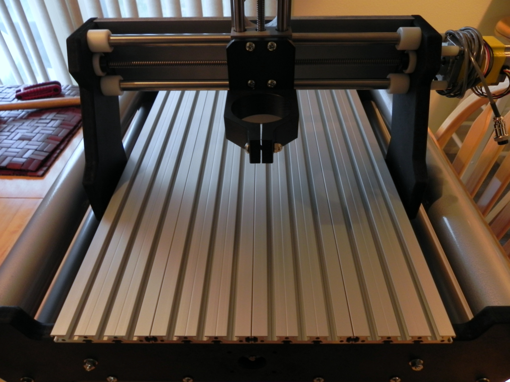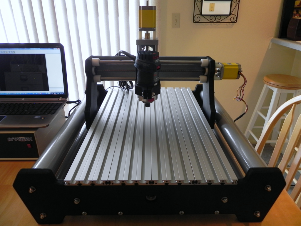 Got the machine fully assembled and operational (minus adjustments). There were a few gotchas today that took me some time to figure out. This is a case of lack of updated documentation from Probotix. I opted to purchase the aluminum extrusion spoil board and assumed that the mounting would be similar to the MDF version. Of course I needed to assemble the board since it came wrapped in four separate sections. I pulled up the web site and searched for some assembly instructions for the aluminum board but, none are available. I eye-balled the screw mounts on the end pieces and figured out how the spoil board was supposed to go together. No problem there but, I had to make multiple adjustments to the metal bracket that mounts to the underside of the spoil board to hold it all together. This metal bracket slides into the T-slots on the board and is held in place with screws and T-nuts. One interesting point I find odd is you can order the aluminum spoil board as an upgrade option with the CNC kit however, the mounting hardware has to be purchased separate.