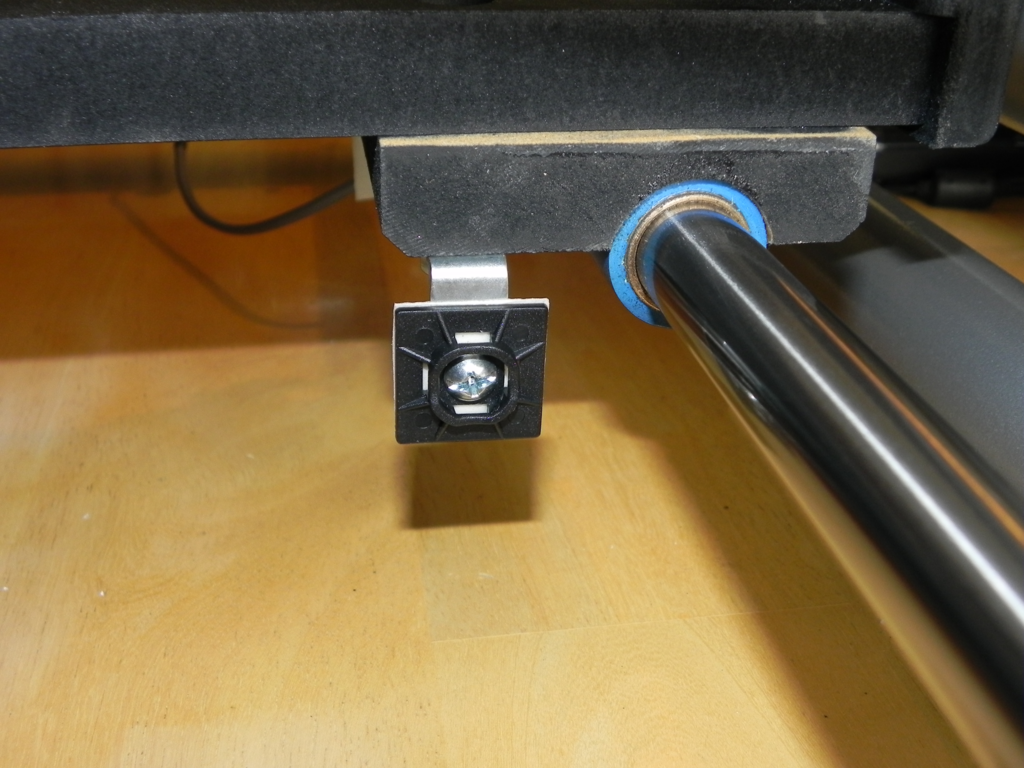 Okay, spoil board is together now and, after multiple attempts, I was able to get the brackets adjusted so that the board would fit onto the machine. I figured I was in the home stretch and attempted to secure the spoil board to the frame of the machine with the 4″ hex cap screws when I realized the screws do not screw all the way through the nut plates. Hmm, what now? I searched the internet and remembered the V90 Yahoo support group. A quick post and a few searches found the answer…I needed to remove the nut plates from the frame and run the 4″ screws through the bare holes into the spoil board. I removed the nut plates by threading one of the 4″ screws and tapping on it with a rubber mallet. The below picture shows the mounting location and the screw threaded so I can remove the nut plate: