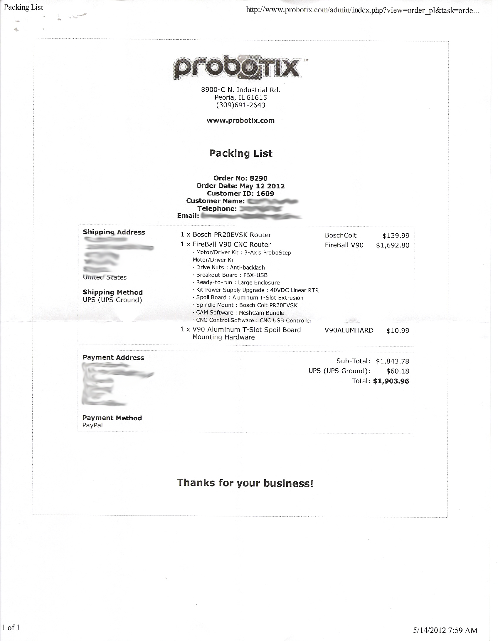 The fine folks at Probotix was quick to respond to my email and assured me that a replacement lid would be sent out to me in the mail. So far, I am very impressed with Probotix as their support is hands-down A+. I’ll continue tomorrow with unboxing and inspecting the remaining components but, for now I’ll end this post with a copy of my receipt as proof (IMO) that you can probably get a quality entry level machine on a budget. Hopefully I don’t wind up eating my words.