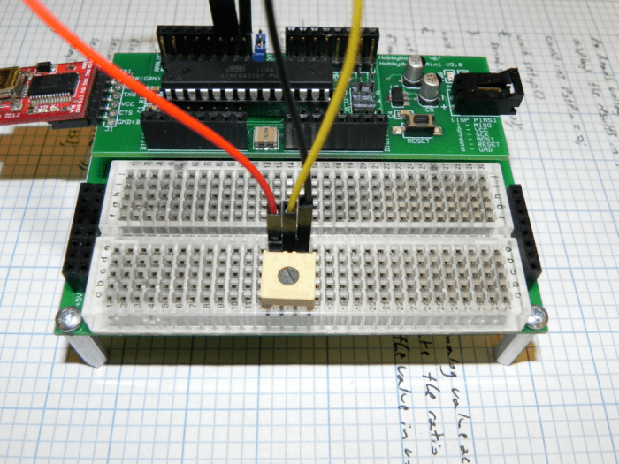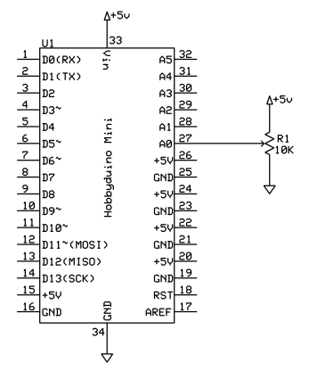 The voltage level measured by analog pin 0 varies as you adjust the position of the wiper. The ATMega328 used on the Hobbyduino Mini contains a 6 channel, 10-bit analog to digital converter (A/D). The A/D maps input voltages between 0 and 5 VDC into an integer value between 0 and 1023. This conversion is achieved by the Arduino analogRead() function.