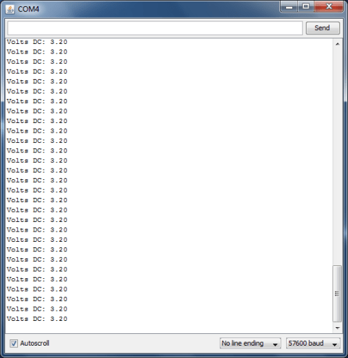 /* Reads voltage across a 10K Pot and displays the results in the serial monitor */ #define POTpin 0 // Potentiometer connected to analog pin 0 void setup() { Serial.begin(57600); // Set serial to 9600 baud } void loop() { int val = analogRead(POTpin); // Read analog value across Pot float volts = (val/1023.0) * 5.0; // Calculate the ratio Serial.print("Volts DC: "); Serial.println(volts); // Print value in volts delay(1000); // Delay 1sec }