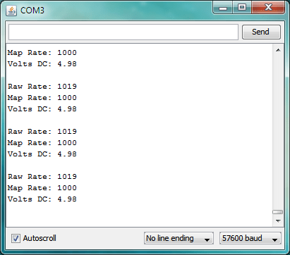 The resistance of the LDR decreases when the amount of light it detects increases. The level of light across the LDR changes the voltage level measured by analog pin 0. You’ll notice in the above screen shots that the voltage is near 5V when maximum light is shined on the LDR and near 0V when minimum light is shined on the LDR. The blink rate of the LED is scaled to a value between 100 and 1000 usec by way of the Arduino map() function.