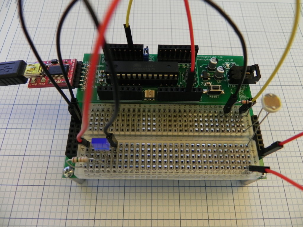 This tutorial covers measuring light levels by interfacing a Light Dependent Resistor (LDR) to a Hobbyduino Mini. The example sketch will vary the blink rate of an LED based on the intensity of light that strikes the LDR.